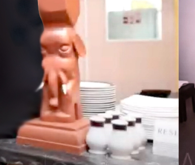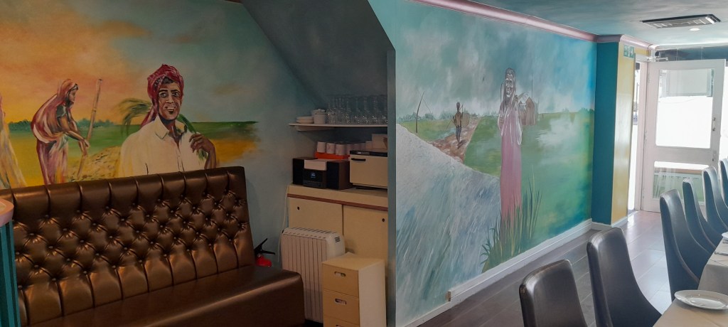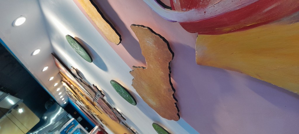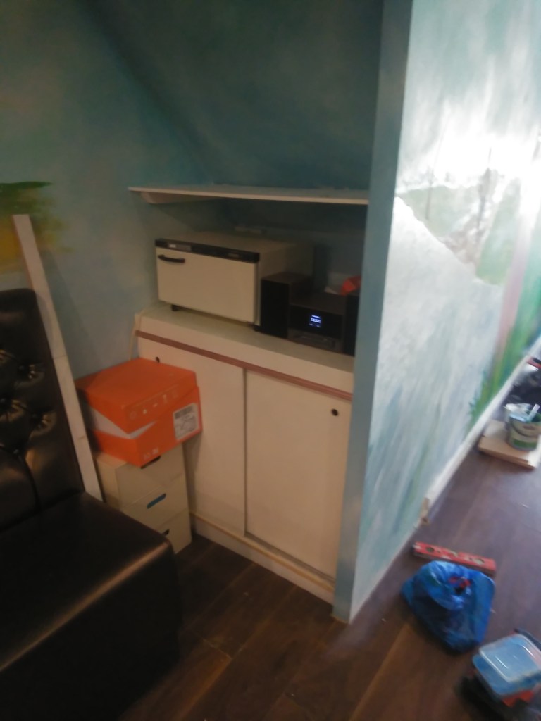 cabinets made under the stairs and various supplies applied to the customized space, sofas and benches with particular finishes and artistic applications in shaped and carved wood.